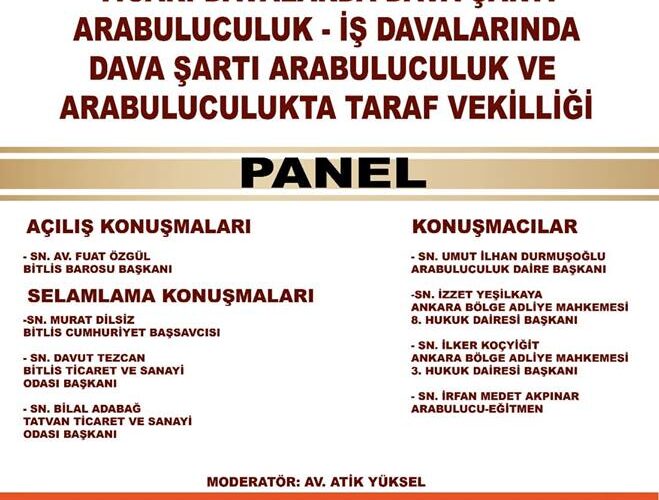 Bitlis Barosu tarafından 28 Eylül 2019 Cumartesi günü, Adalet Bakanlığı Arabuluculuk Daire Başkanı Sn. Umut İlhan DURMUŞOĞLU, Ankara Bölge Adliye Mahkemesi 8. Hukuk Dairesi Başkanı Sn. İzzet YEŞİLKAYA, Ankara Bölge Adliye Mahkemesi 3. Hukuk Dairesi Başkanı Sn. İlker KOÇYİĞİT ve Arabulucu- Eğitmen Sn. İrfan Medet AKPINAR’ ın sunumu ile “Ticari Davalarda Dava Şartı Arabuluculuk- İş […]