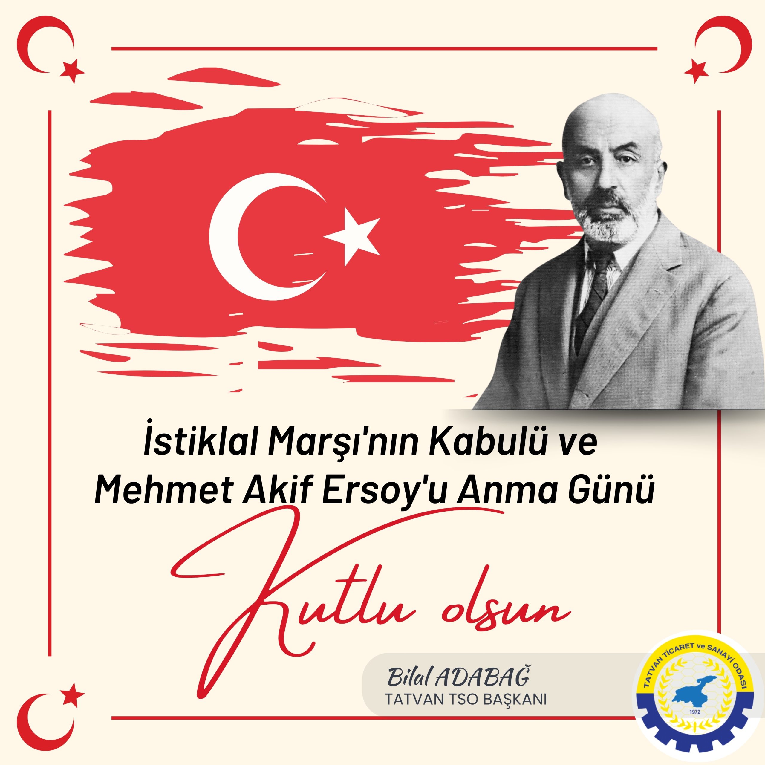 Vatanımızın birliği ve Milletimizin bağımsızlığı uğruna verilen mücadelenin kazanıldığı 30 Ağustos Zafer Bayramının yıldönümünde, Kurtuluş Savaşı’nın tüm kahramanlarını, kanlarıyla, canlarıyla bu toprakları vatan yapan Aziz Şehitlerimizi, ebediyete intikal eden Gazilerimizi rahmet, saygı ve minnetle anıyor, 30 Ağustos Zafer Bayramının 97. Yılını en içten duygularla kutluyorum. Bilal ADABAĞTatvan TSO Başkanı