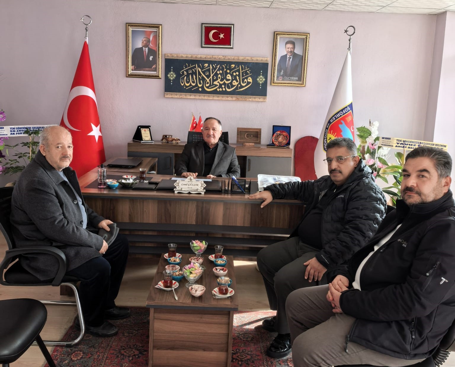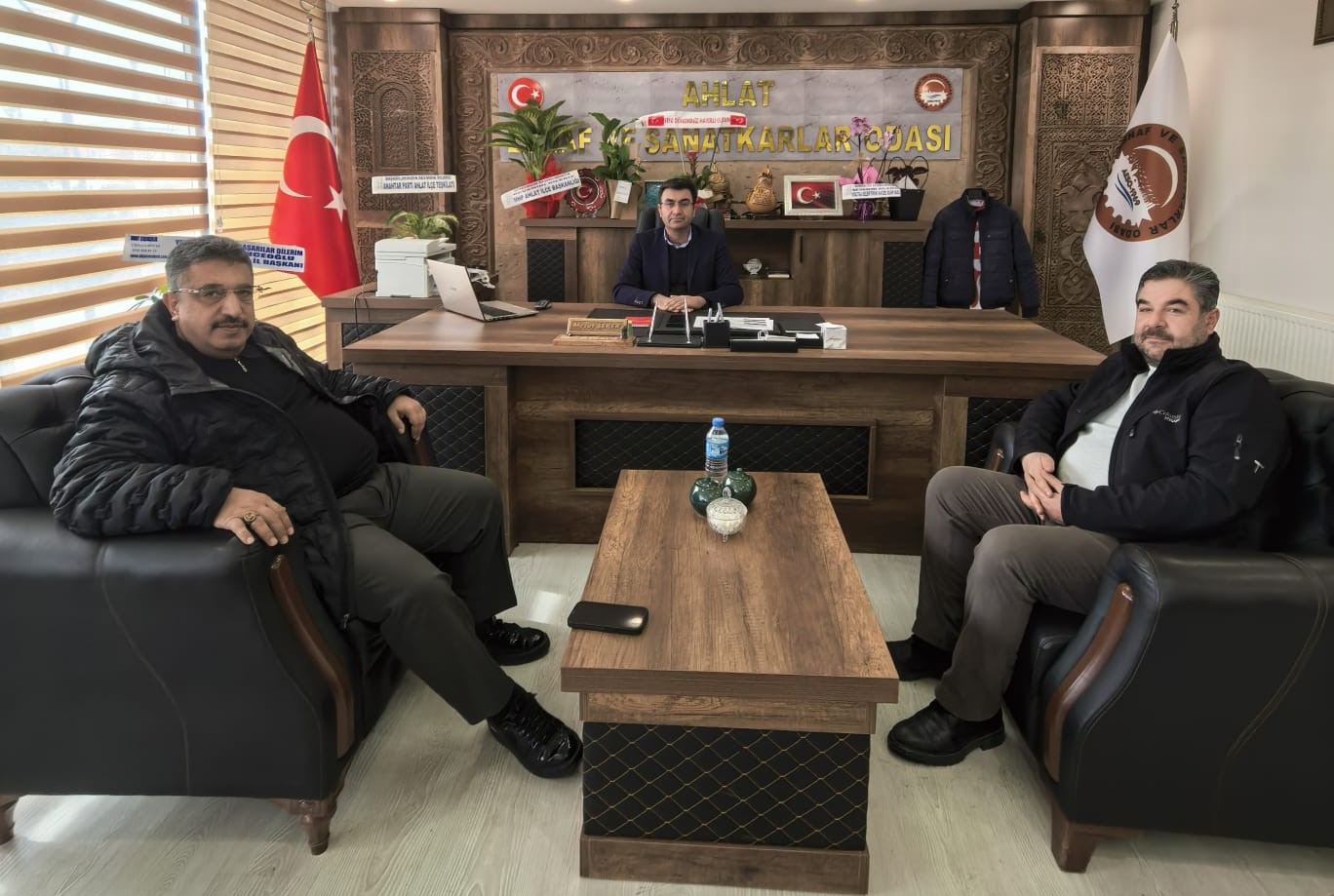 Oda Başkanımız Bilal Adabağ ve Odamız Başkan Yardımcısı Yılmaz Lebit ile birlikte gerçekleştirilen genel kurullar sonucunda yeniden başkanlığa seçilen Ahlat Esnaf ve Sanatkârlar Odası Başkanı Mesut Şeker ile Ahlat Şoförler ve Otomobilciler Esnaf Odası Başkanı Cemil Gülsar’a “hayırlı olsun” ziyaretinde bulundu.