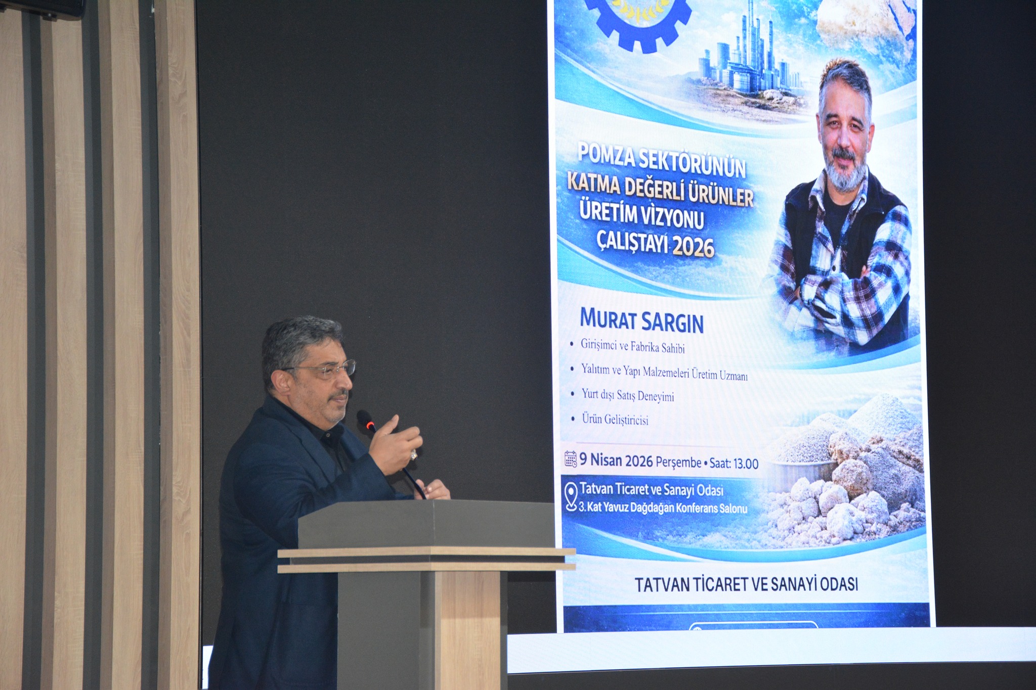 Ardından Girişimci ve fabrika sahibi Murat Sargın tarafından “Pomza Sektörünün Katma Değerli Ürünler Vizyonu” konulu çalıştay sunumunu yaparak sektördeki tecrübelerini paylaştı.