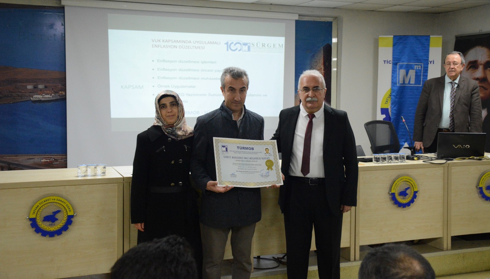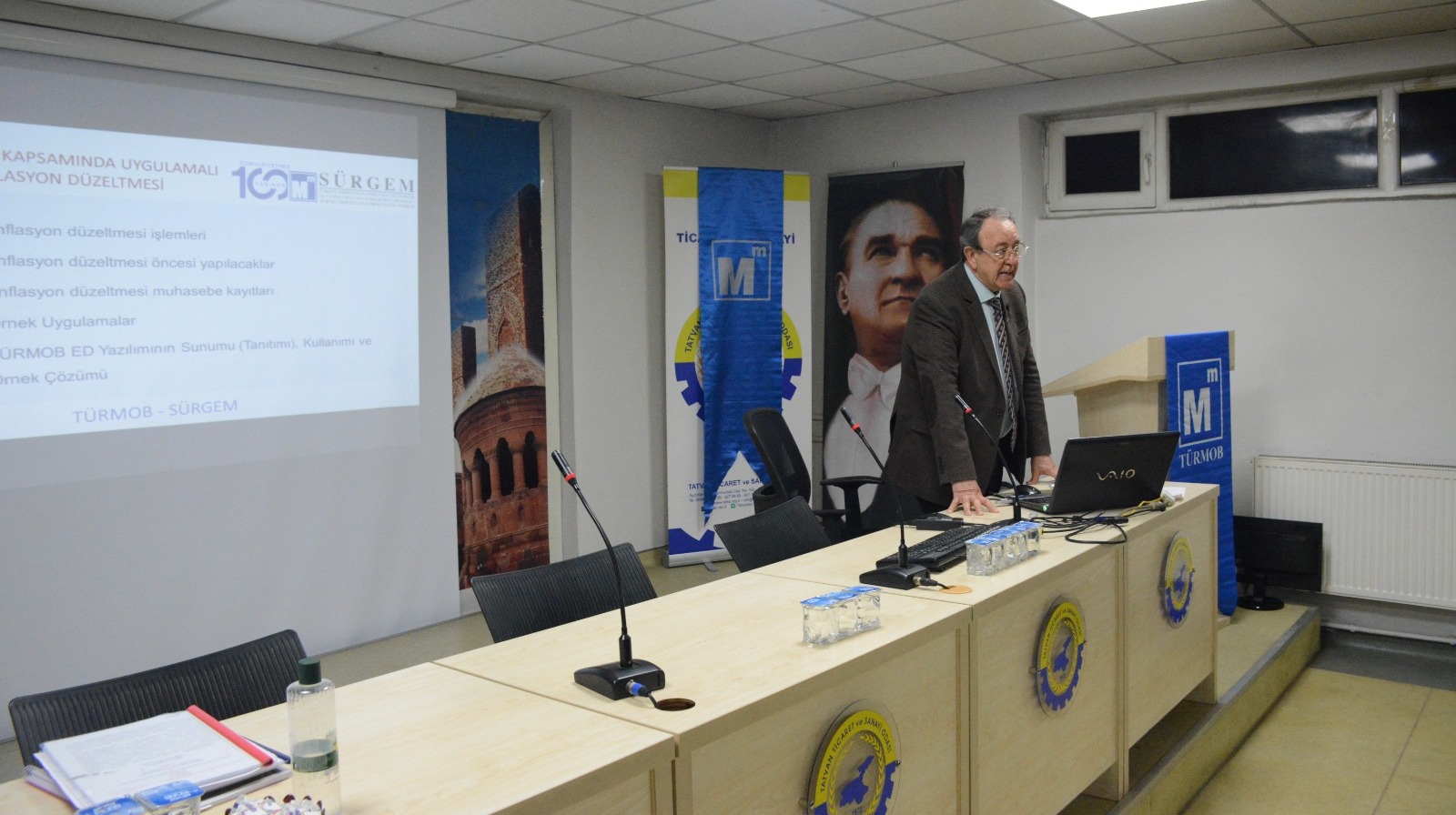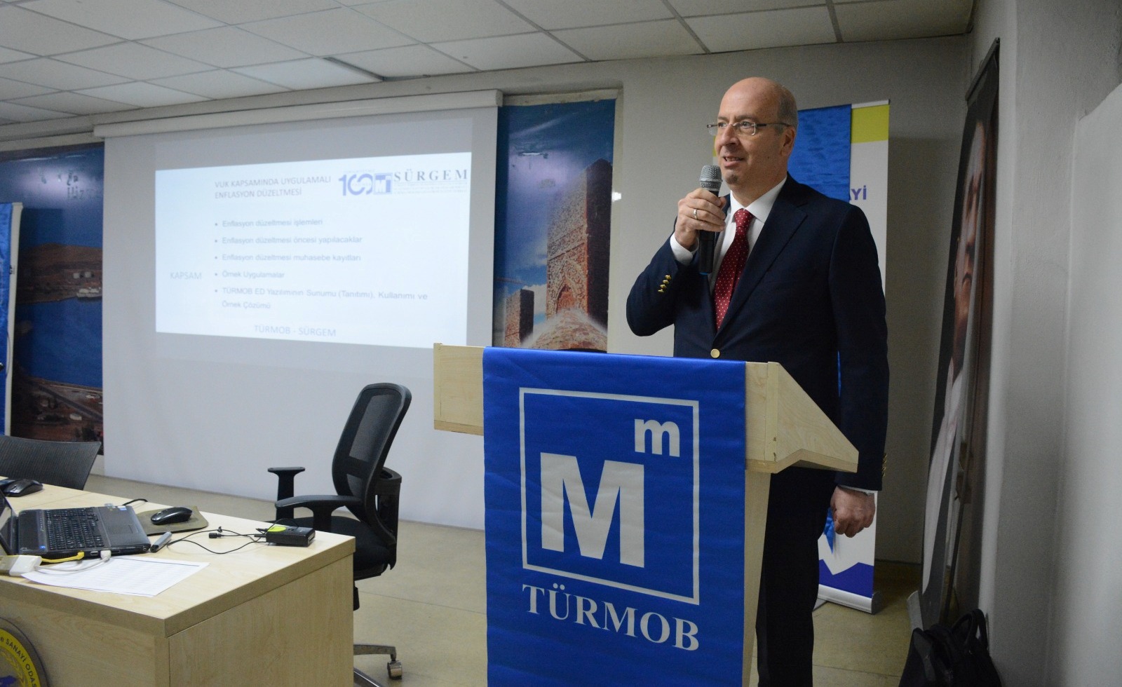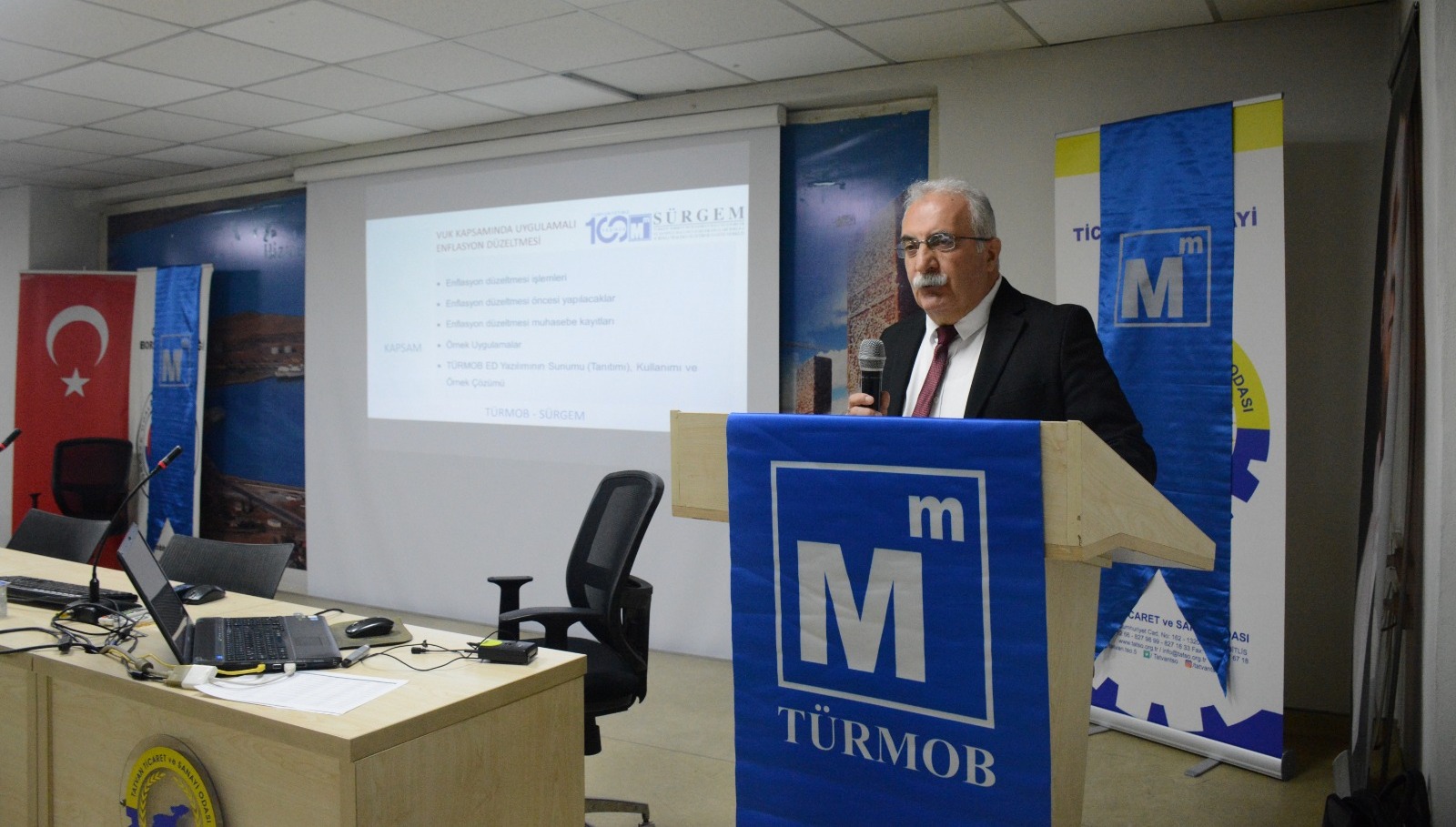 Ardından, TÜRMOB – SÜRGEM Eğitmeni Mustafa Necati Balcı tarafından enflasyon düzeltmesi öncesi ve sonrası yapılması gereken işlemler, muhasebe kayıtları ve örnek uygulamalar üzerine bir sunum yapıldı.